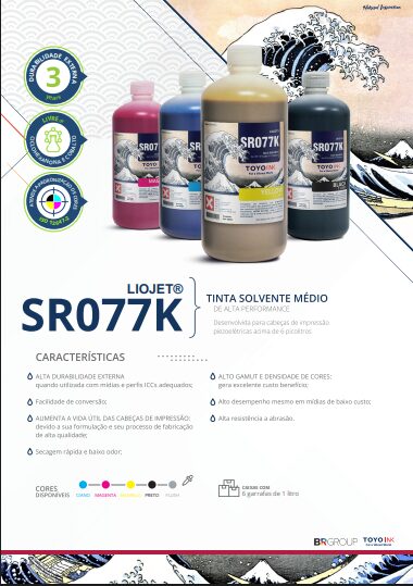 Tinta Solvente Médio de alta performance e indicada para cabeças impressão piezoelétricas acima de 6 picolitros. A tinta Toyo SR077K Solvente é uma excelente tinta com ótimo desempenho, mesmo em mídias de baixo custo. Possui secagem rápida, baixo odor e alta resistência a abrasão.