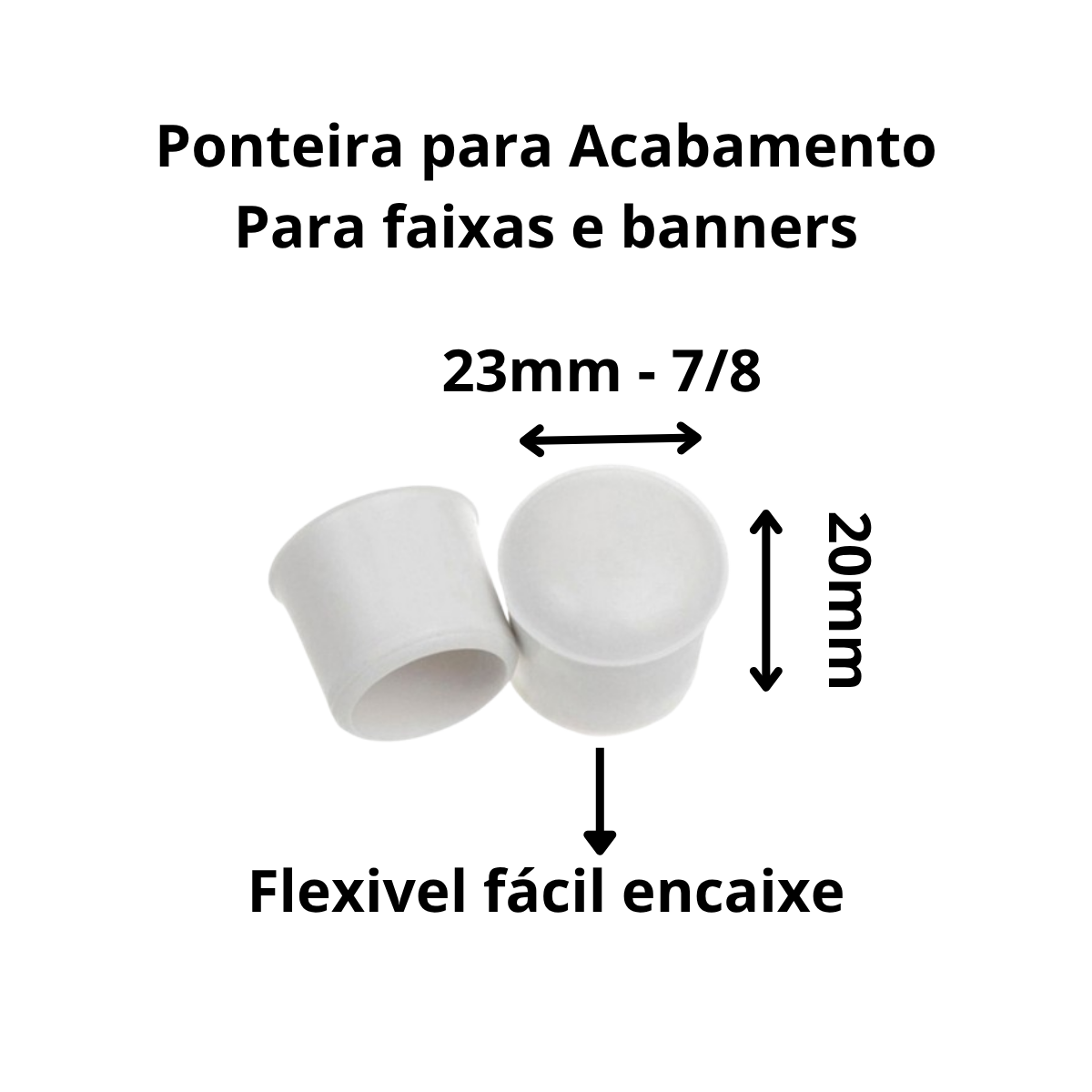 Ponteira branca 23mm 7/8 é o acessório perfeito para acabamento de banners e faixas. Fabricada em plástico ABS de alta qualidade, essa ponteira proporciona uma fixação firme e duradoura. É fácil de instalar, dispensando o uso de ferramentas e tornando o processo de montagem de banners e faixas mais ágil e eficiente.